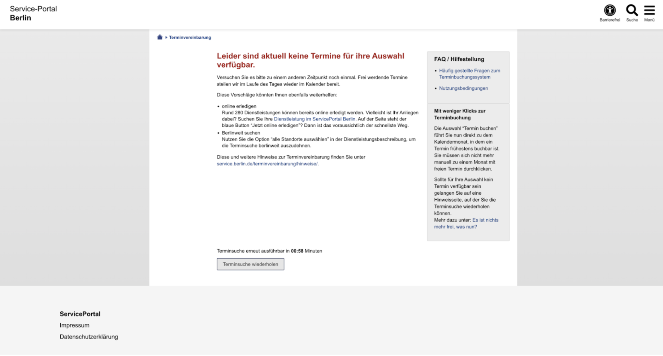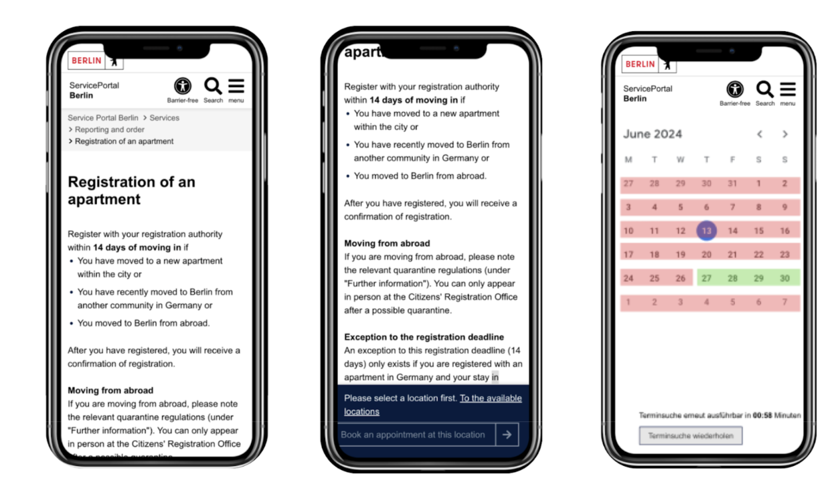The most common pattern to book an appointment goes like this: You search for “Berlin Anmeldung” on Google because someone at work told you that you need to do this to avoid any trouble. You click the first link that appears. A page with an overwhelming amount of text opens. You try to read it, but since it’s in German and your level is only B1, you can’t understand it, so you start looking for a button. You click what seems to be the right button and land on another page filled with more text—and something in red, along with a countdown.