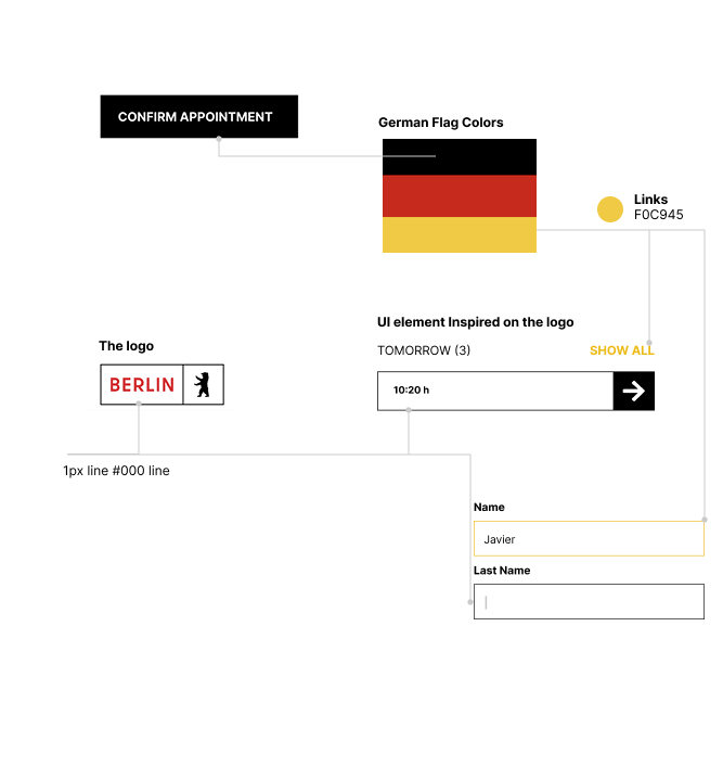 In this visualization, you can see how I incorporated the colors and distinctive shapes from the Berlin logo to add personality to UI elements like text inputs, dividers, and buttons.