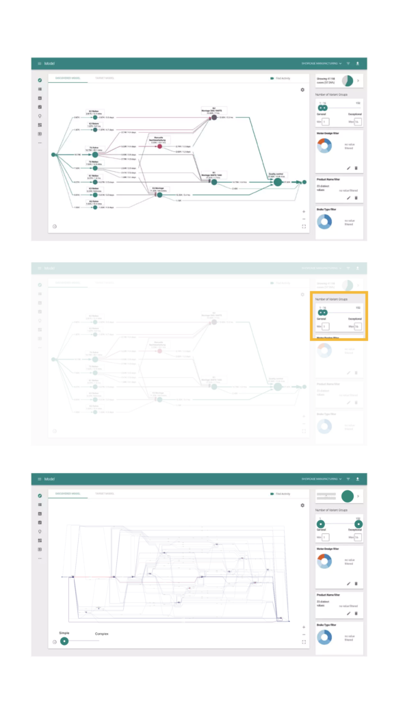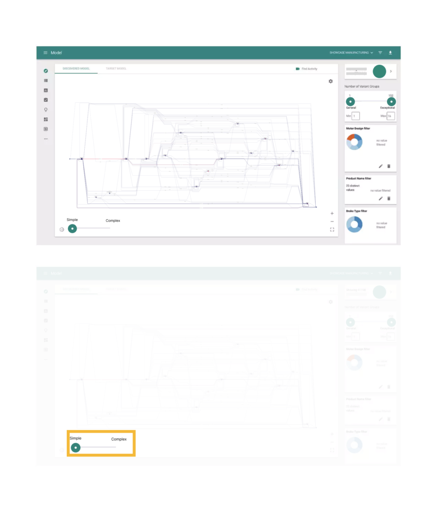 However, I observed that while the concept was intuitive for experts, it could be confusing for new users unfamiliar with process mining. In contrast, the simple/complex slider was not well understood by the customer success team, resulting in little to no usage.