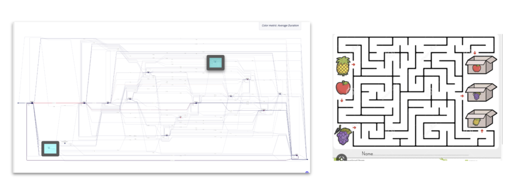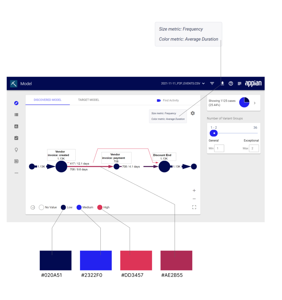 Another challenge our process mining users faced was with the legend. The references to color and size weren’t immediately clear. We only saw two colors in the legend (red and blue), but a closer look at the diagram revealed additional hues that weren’t accounted for. It took users 1–2 minutes to figure out that blue indicated the fastest cases, red represented the slowest, and any mixed color fell somewhere in between.