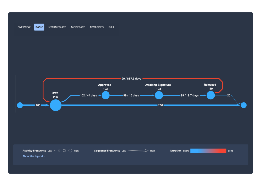 Testing revealed that users found it helpful to switch between tabs and better grasp how simpler versions of the diagram filtered out less frequent activities. However, they expressed the need for a clearer way to comprehend the full complexity of the process diagram.
