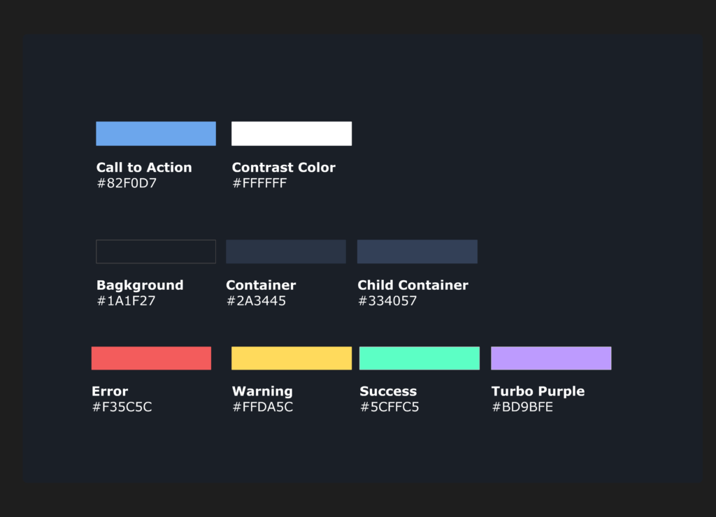 We chose these colors for dark mode to ensure accessibility, brand consistency, and usability. The deep background (#1A1F27) and layered containers (#2A3445, #334057) reduce eye strain while maintaining hierarchy. Vibrant accents like the CTA (#82F0D7) and Turbo Purple (#BD9BFE) align with brand identity and ensure clarity.